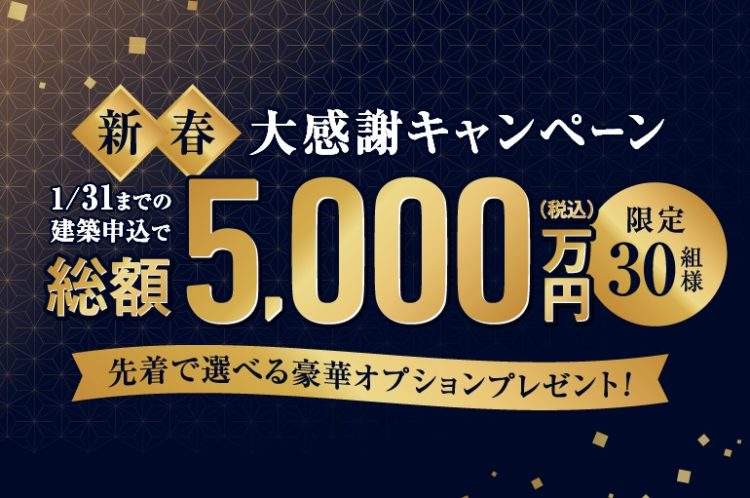 1月中の建築申込で総額5000万円分選べる豪華オプションプレゼント!