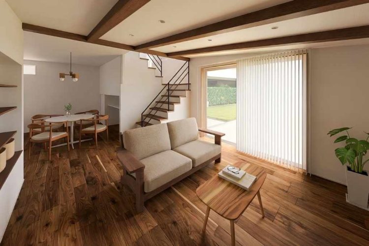 リビングには勾配天井と登り梁のアクセント。